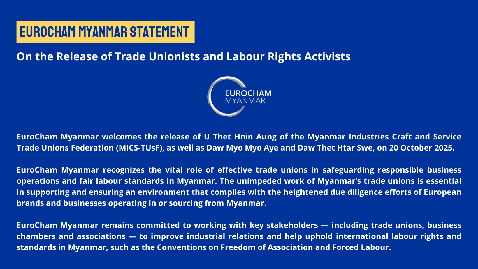 EuroCham Myanmar welcomes the release of U Thet Hnin Aung of the Myanmar Industries Craft and Service Trade Unions Federation (MICS-TUsF), as well as Daw Myo Myo Aye and Daw Thet Htar Swe, on 20 October 2025.
