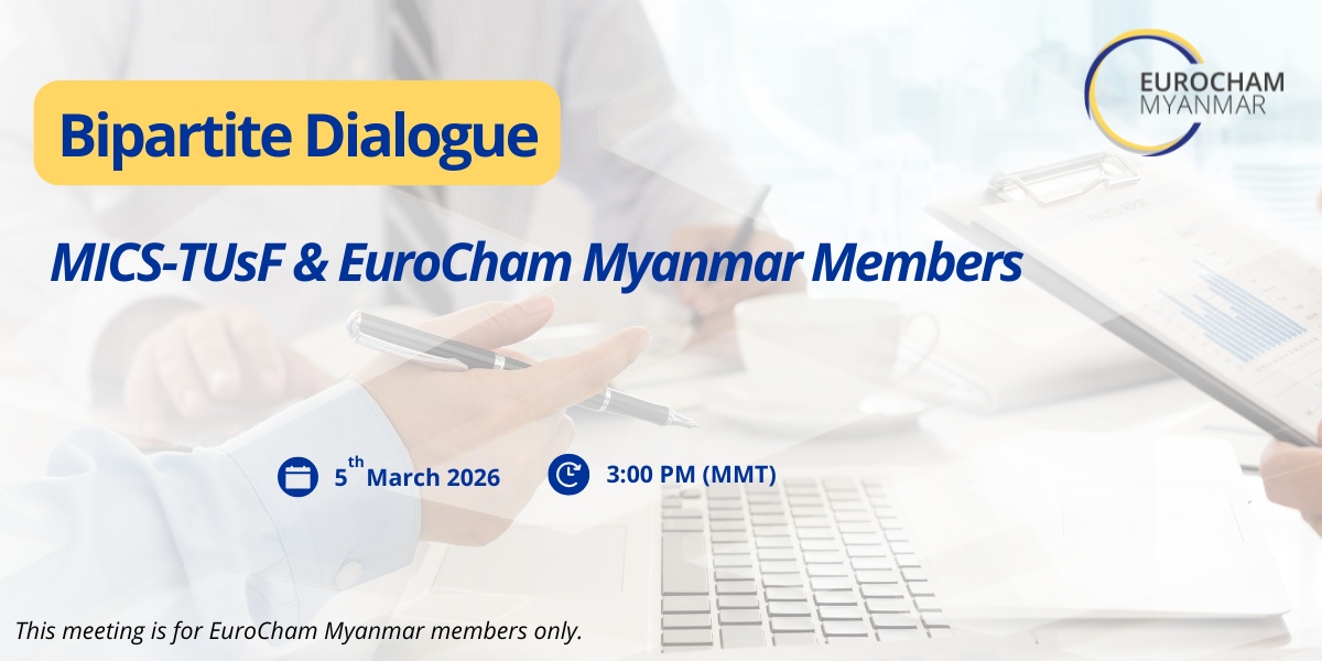 Taking place on 5 March 2026 (Thursday), this online dialogue will provide a constructive platform for open exchange and communication between members of EuroCham Myanmar and representatives of MICS-TUsF, with the objective of strengthening industrial relations, promoting respect for labour rights, and fostering practical cooperation between employers and trade unions in Myanmar.