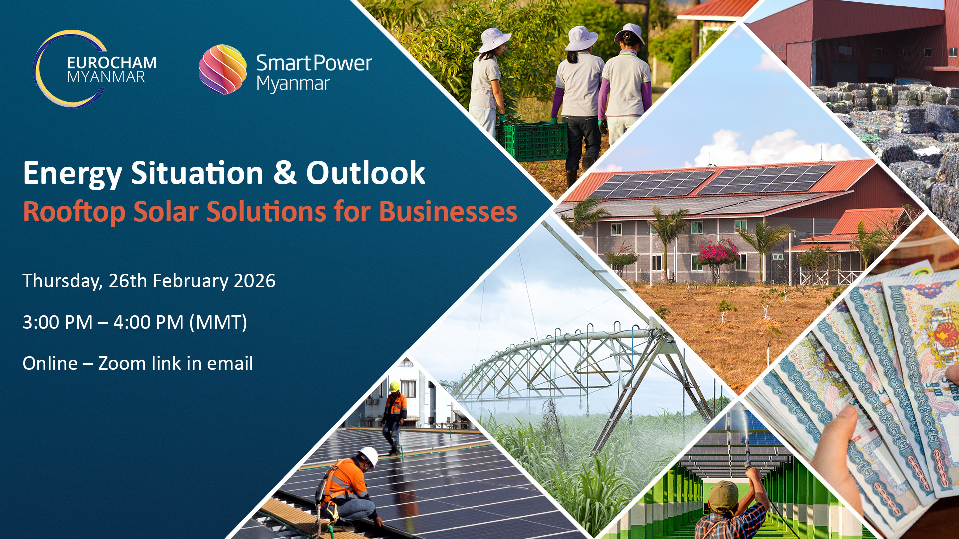 EuroCham Myanmar is pleased to host an online event: Energy Situation & Outlook: Rooftop Solar Solutions for Businesses, organised in collaboration with our member, Smart Power Myanmar. Following the elections, recent changes in Myanmar’s energy sector present challenges and opportunities for businesses seeking to adopt rooftop solar and other alternative energy solutions. This panel discussion will examine the challenges and opportunities businesses face in adopting these solutions.