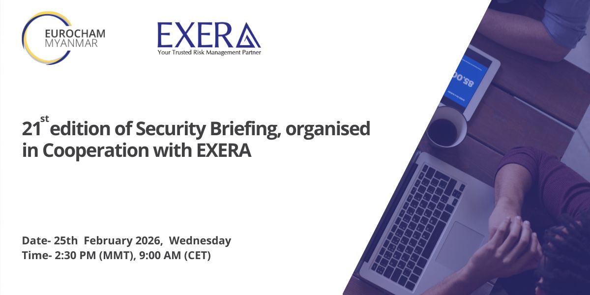 EuroCham Myanmar will organize the 21st Edition of Security Briefing, in collaboration with our Silver Partner member, EXERA Myanmar. The session will take place on 25th February 2026 (Wednesday) and will provide an overview of the current political landscape and security situation across Myanmar. This exclusive, members-only event provides timely insights and risk assessments relevant to your operations in the country.