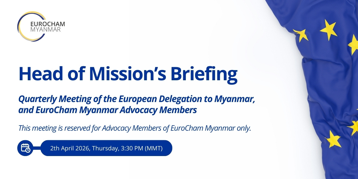 This briefing continues EuroCham Myanmar’s initiative to facilitate regular engagement between the EU Delegation to Myanmar and our members. Held in a hybrid format, it is open exclusively to our members, with the Head of Mission and invited speakers from each advocacy group attending in person. The session will provide updates on European business operations in Myanmar, drawing on the latest Business Confidence Survey, while allowing members to share sectoral insights and hear developments from the EU Delegation.