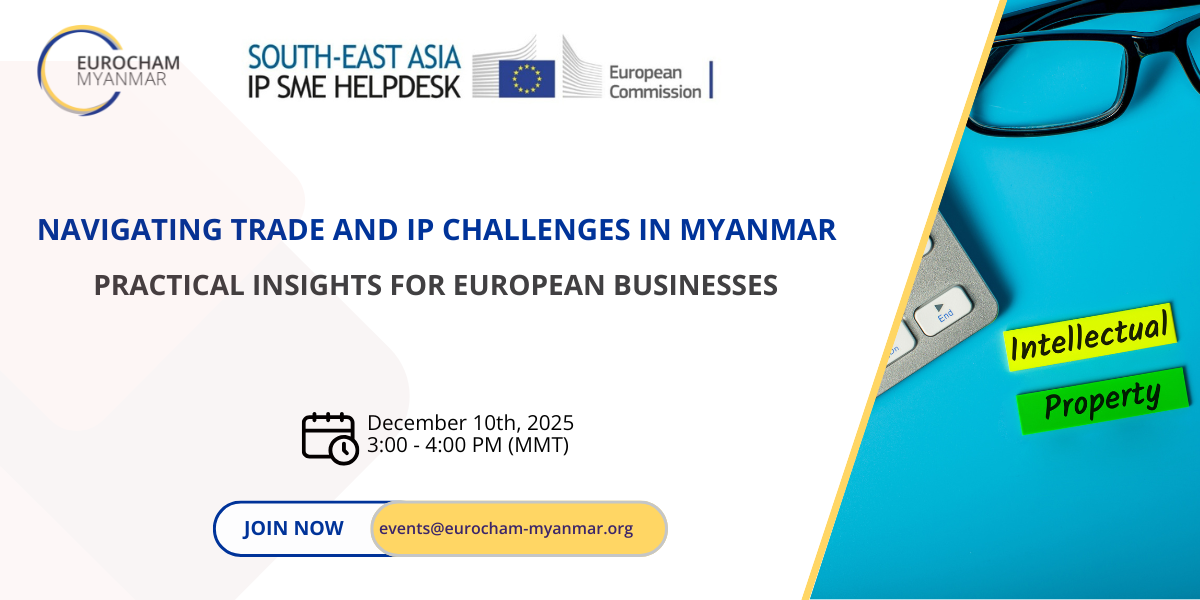 EuroCham Myanmar is pleased to organise a webinar on “Navigating Trade and IP Challenges in Myanmar: Practical Insights for European Businesses”, organised in collaboration with the South-East Asia IP SME Helpdesk, an initiative of the European Commission.