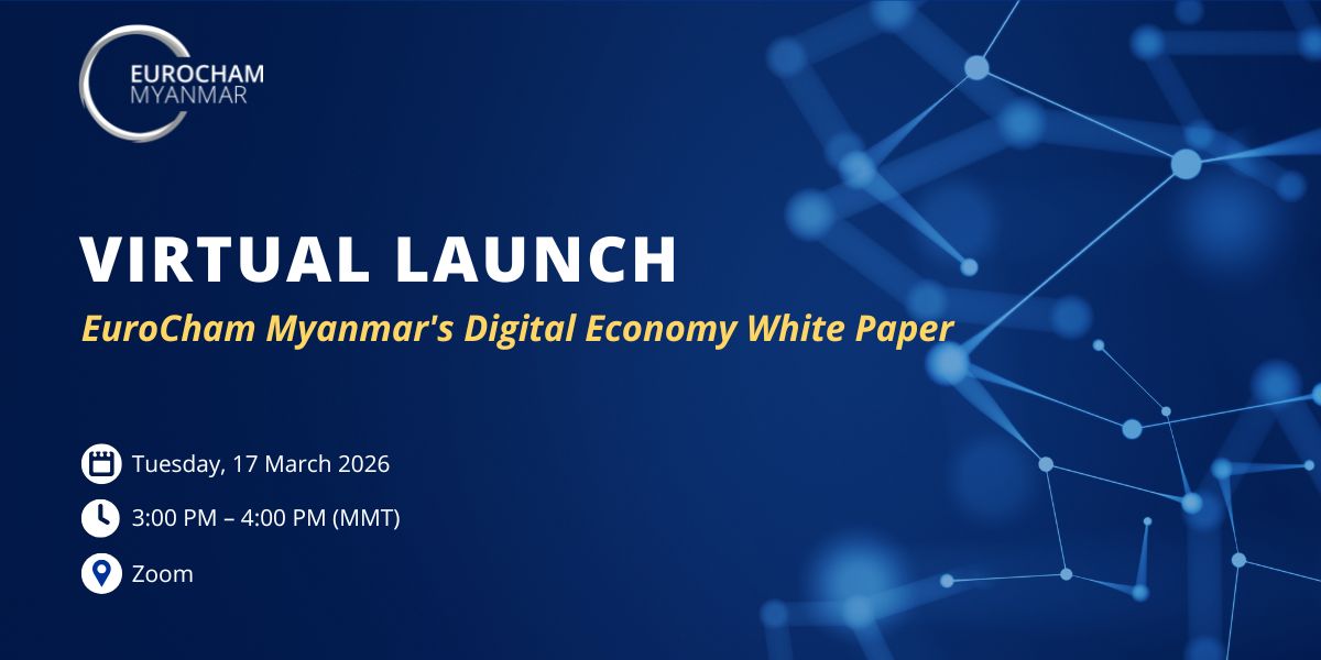 We are pleased to organize the Virtual Launch of EuroCham Myanmar’s Digital Economy White Paper. Following its publication on 10 March 2026, EuroCham Myanmar will host a virtual launch event of the White Paper on Tuesday, 17 March from 3:00–4:00 PM (MMT) to present the key findings and recommendations. The link to access the Digital Economy White Paper can be accessible from here.